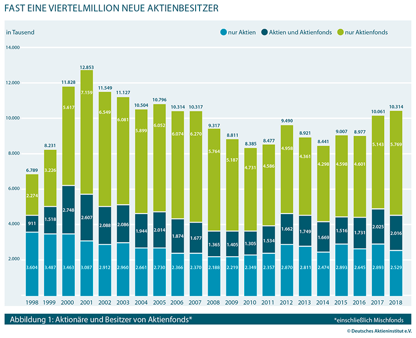 Das Interesse an der Aktien- und Aktienfondsanlage hat sich in den letzten Jahren spürbar verfestigt. Rund jeder sechste Bundesbürger hat 2018 in der einen oder anderen Form in Aktien investiert. Damit erreicht die Zahl der Aktienbesitzer den höchsten Wert seit 2007 berichtet das Deutsche Aktieninstitut in der aktuell veröffentlichten Studie "Aktionärszahlen 2018". Insgesamt besaßen rund 10,3 Millionen Bürger, also 16,2 Prozent der Deutschen, die älter sind als 14 Jahre, Aktien oder Aktienfonds. Die breite Masse in Deutschland an die Aktienanlage heranzuführen, bliebe jedoch eine Herausforderung. Noch immer legen die meisten Deutschen ihr Geld lieber auf Girokonten und nahezu zinslosen Sparbüchern an, als die Aktienanlage zu nutzen. Wer stärker auf Aktien und Aktienfonds setze, so das DAI, erziele langfristig höhere Erträge und könne damit leichter Ersparnisse aufbauen und für das Alter vorsorgen. So konnten Anleger, die langfristig in den Deutschen Aktienindex DAX investiert haben, in der Vergangenheit jährlich durchschnittlich Erträge in Höhe von sechs bis neun Prozent erwirtschaften.